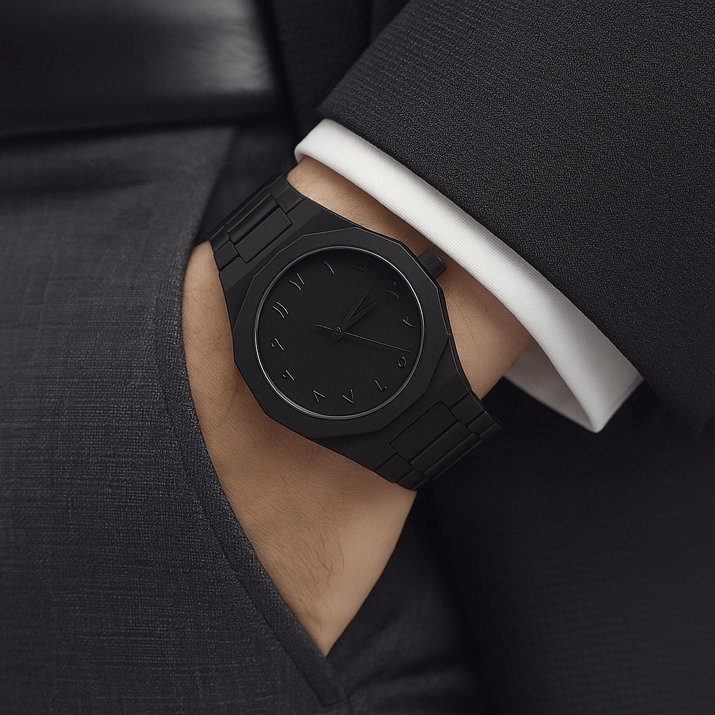 Discover the perfect blend of modern minimalism and timeless tradition with the Matte Black Arabic Aura Watch. Featuring a smooth all-black finish and unique Eastern Arabic numerals, this bold design makes a statement through simplicity.