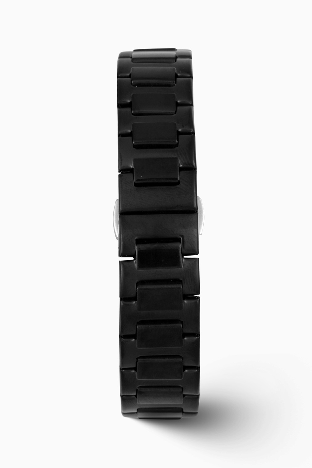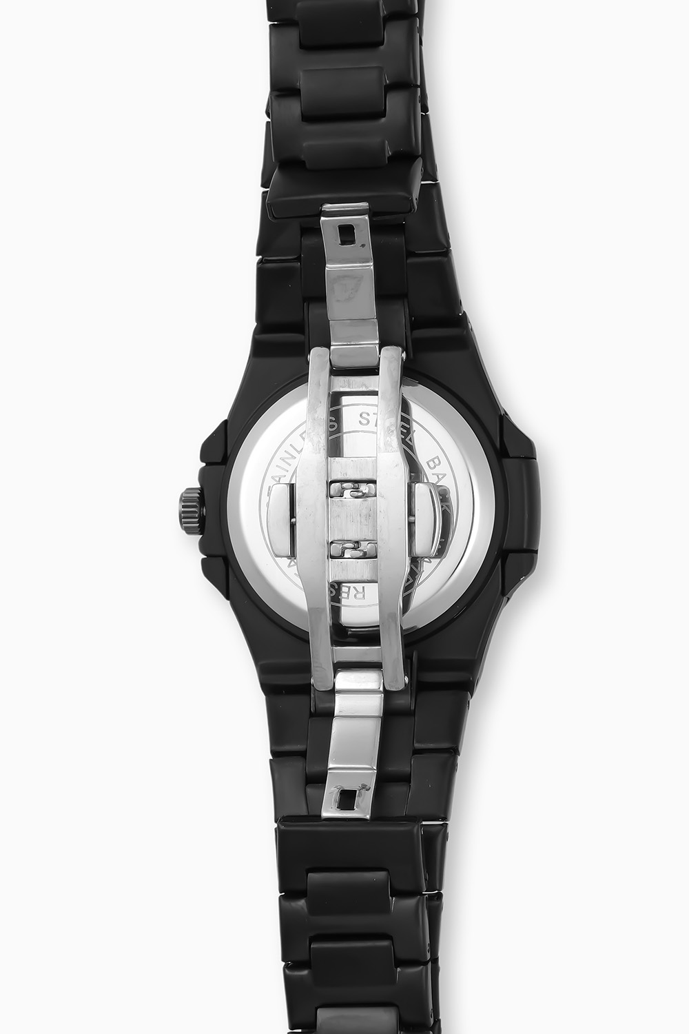 The jet-black finish, minimalist design, and comfortable bracelet make it perfect for everyday wear or formal evenings.