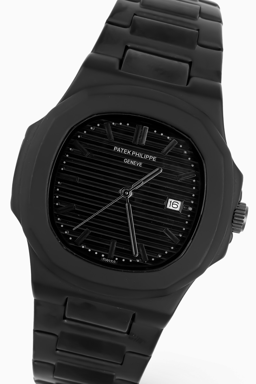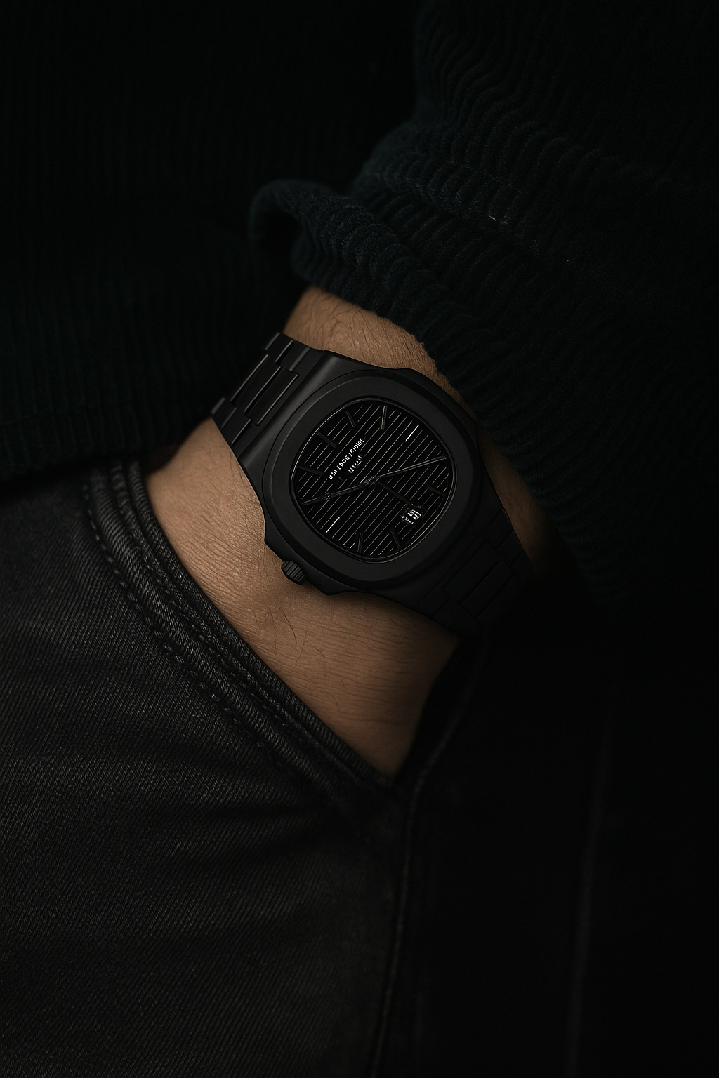 Inspired by bold elegance and cinematic style, the Midnight Nautilus is a stunning all-black stainless steel watch designed for those who demand attention without saying a word. With its iconic rounded-octagonal bezel and horizontally lined dial, this timepiece pays homage to the legendary Patek Philippe Nautilus silhouette—famously worn in John Wick.