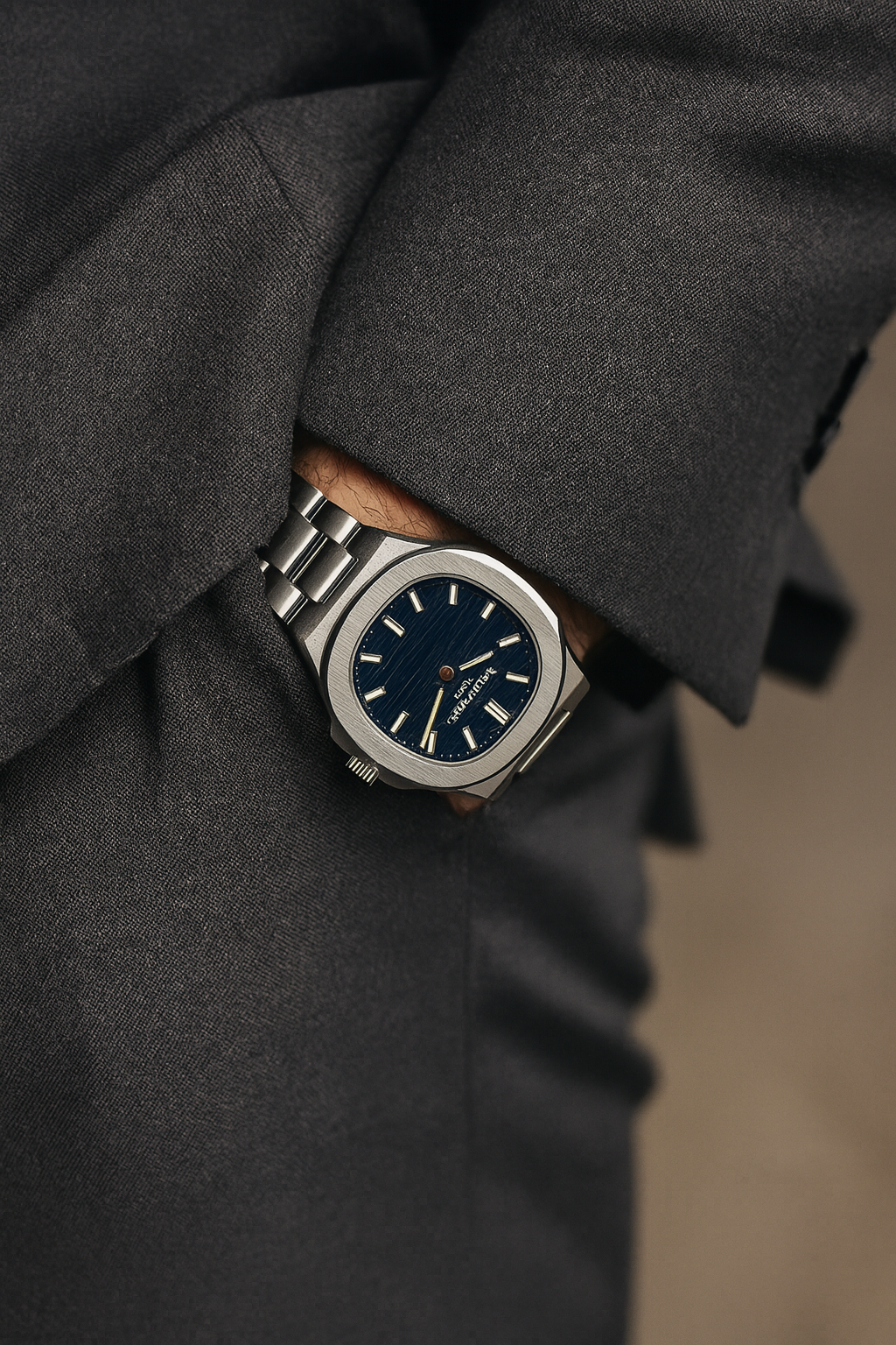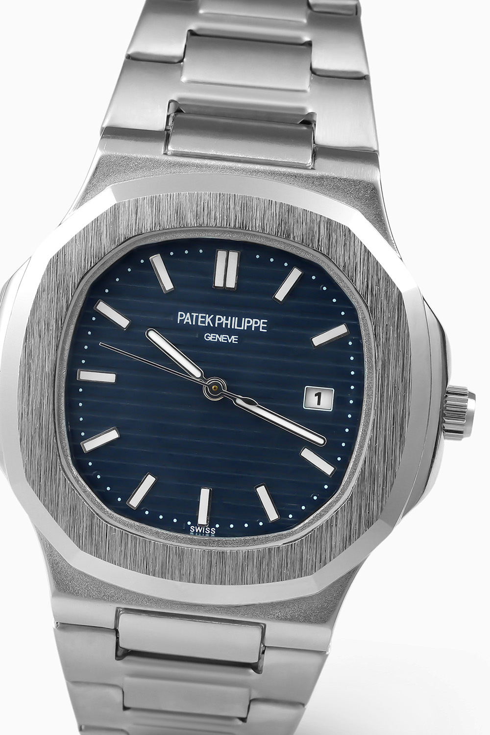 Patek Philippe Nautilus inspired silver mist stainless steel automatic watch with integrated bracelet.