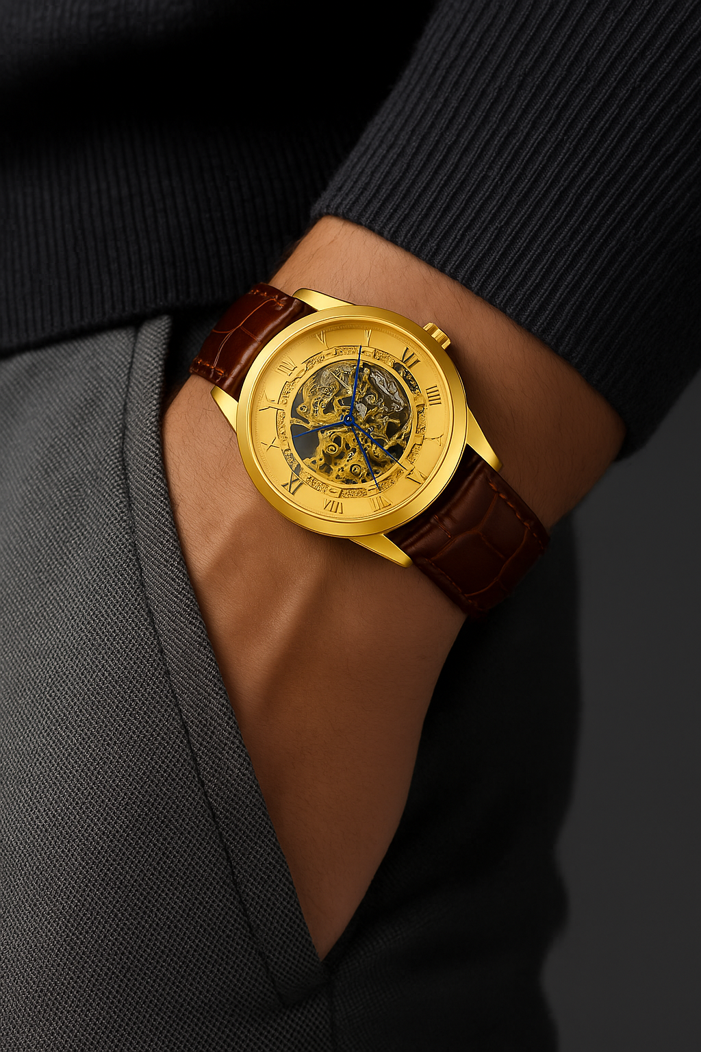 Elevate your style with the Royal Gold Skeleton, a captivating timepiece designed for those who appreciate intricate craftsmanship and vintage elegance. With its transparent dial revealing the beautifully detailed inner mechanics, this watch combines the art of horology with timeless fashion.