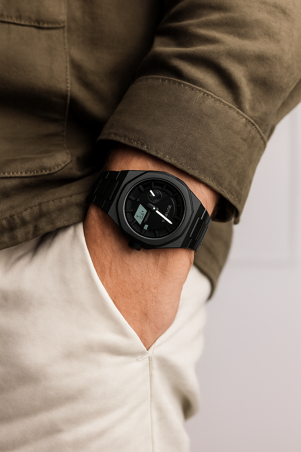 With features like alarm, stopwatch, backlight, calendar, and 50M water resistance, it’s the ultimate companion for the man who demands performance and precision in style.