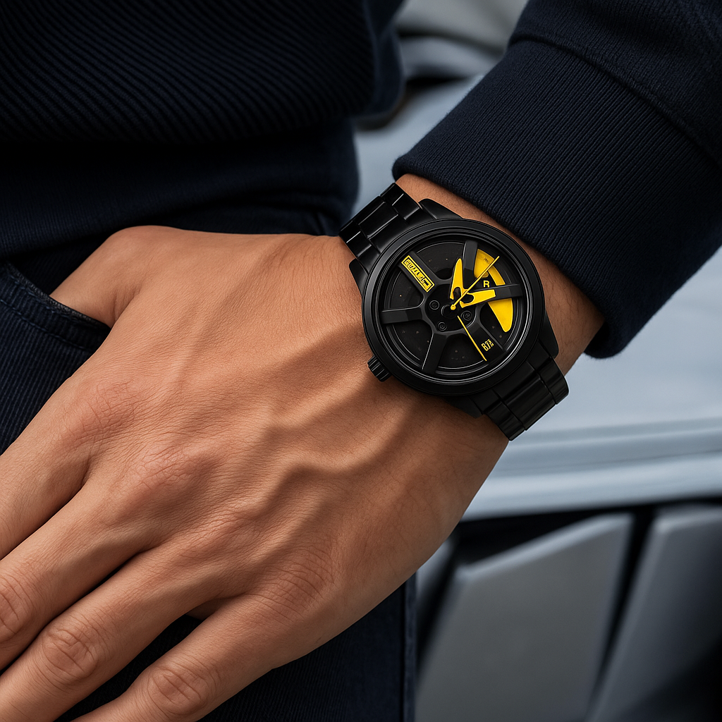 • Unique rotating wheel rim dial (inspired by sports cars)