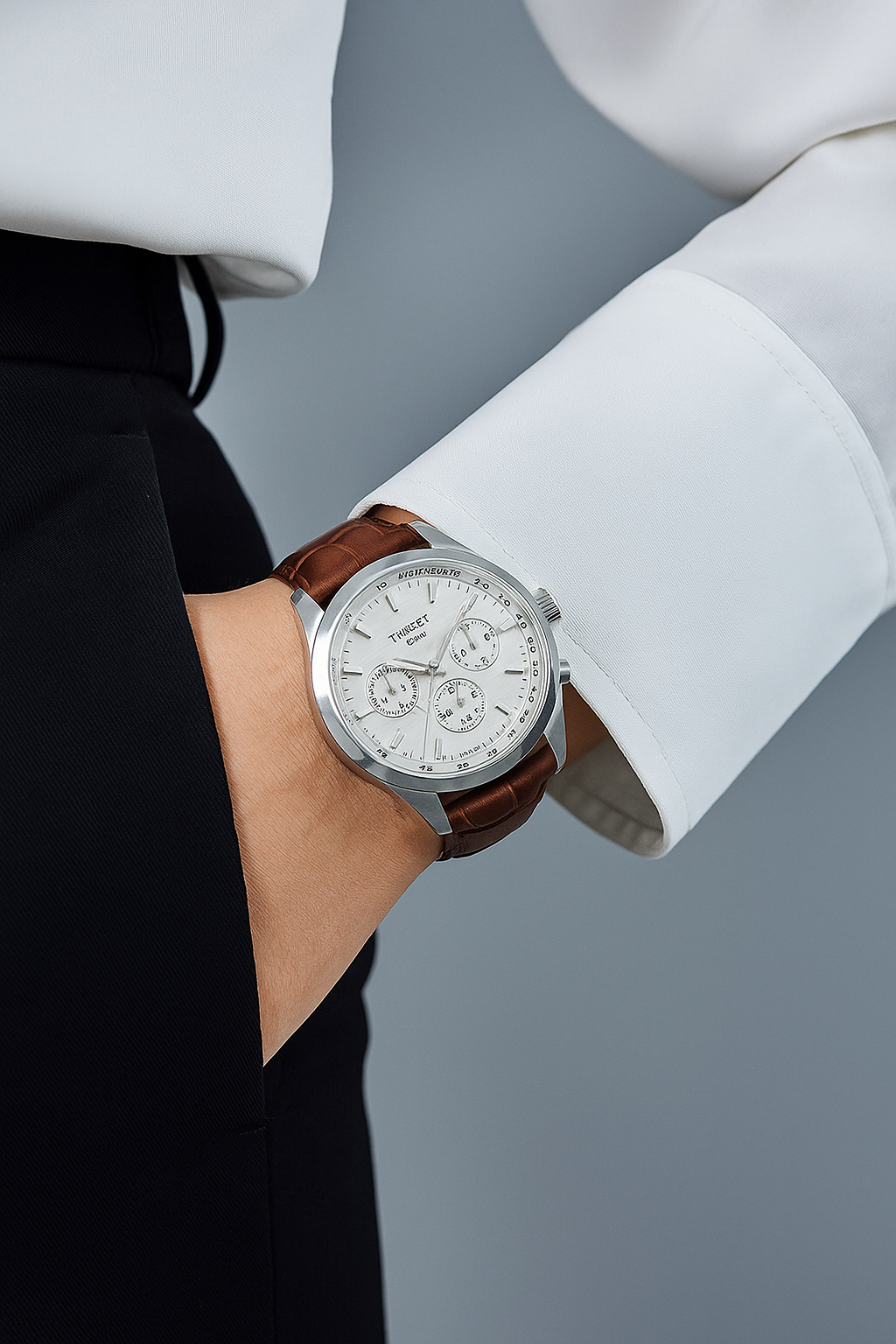Elevate your wrist game with the Tissot Chronograph Classic, a watch that defines timeless Swiss craftsmanship. This elegant piece features a polished silver dial with multiple sub-dials for chronograph precision, complemented by a rich brown leather strap.